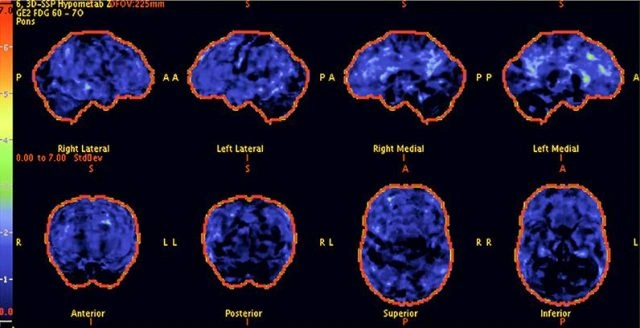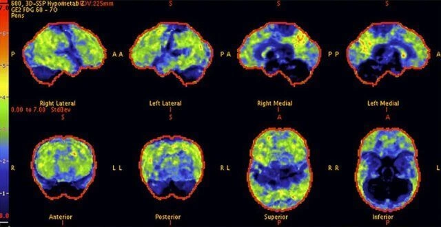 Above: A 68-year-old woman with a 10-year history of migraines, memory decline, and persistent tinnitus. Previous PET scans showed significant neural dysfunction, indicating chronic nervous system impairment.